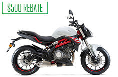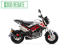 Offer good on all new and unregistered 2022/2023 Benelli TNT135 models. Not all customers will qualify. The finance offer will only be available to credit qualified customers. $300 Rebate good on all new and unregistered 2022/2023 Benelli TNT135 models ONLY. Rebate can only be used for this Benelli TNT135 purchase at the dealership and must be redeemed on the date of purchase. It has no cash value and is not transferable. Example: A total 24-month term with an Amount Financed of $2,900 and 1.99% APR requires monthly payments of $123.35 for 24 months after Rebate. Your actual monthly payment may differ based on financing terms, credit tier qualification, accessories or other factors such as down payment and fees. A 20.42% down payment is required to obtain advertised monthly payment of $123.35. Contact a participating Benelli/SSR dealer for details. Offer expires 08/31/2025