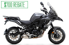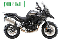 Offer good on all new and unregistered 2022 Benelli TRK502 models. Not all customers will qualify. The finance offer will only be available to credit qualified customers. $700 Rebate good on all new and unregistered 2022 Benelli TRK502 models ONLY. Rebate can only be used for this Benelli TRK502 purchase at the dealership and must be redeemed on the date of purchase. It has no cash value and is not transferable. Example: A total 48-month term with an Amount Financed of $6,400 and 3.99% APR requires monthly payments of $144.48 for 48 months after Rebate. Your actual monthly payment may differ based on financing terms, credit tier qualification, accessories or other factors such as down payment and fees. A 9.03% down payment is required to obtain advertised monthly payment of $144.48. Contact a participating Benelli/SSR dealer for details. Offer expires 08/31/2025