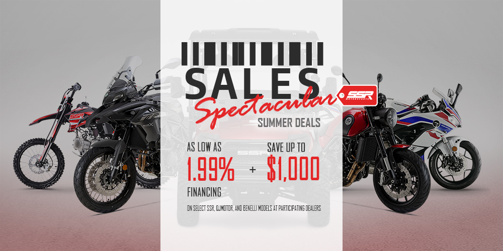 Offer good on all new and unregistered 2025 SR125R / SR125RB / SR140R / SR140RB models. Not all customers will qualify. The finance offer will only be available to credit qualified customers. Example: A total 24-month term with an Amount Financed of $1,100 and 2.99% APR requires monthly payments of $47.27 for 24 months. Your actual monthly payment may differ based on financing terms, credit tier qualification, accessories or other factors such as down payment and fees. Depending on the model in your transaction, a specific down payment is required to obtain advertised monthly payment of $47.27. $100 Value Add comes with the purchase on all new and unregistered 2025 SR125R / SR125RB / SR140R / SR140RB models. Value Add can only be used for accessories purchase at the dealership and must be redeemed on the date of purchase. It has no cash value and is not transferable. Contact a participating SSR dealer for details. Offer expires 09/30/2025.
